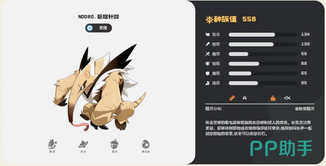 巨噬针鼹虽然属于普通系,但其实战能力不容小觑。它拥有较高的重击输出能力,并且技能组合具备低能耗、持续作战的优势,能够在长时间战斗中稳定发挥。不过需要注意的是,该精灵的操作门槛较高,新手玩家可能难以驾驭。因此更推荐有一定游戏经验的中高阶玩家进行培养,以便充分发挥其战斗潜能。
