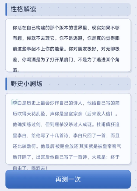 测试完成后,系统将输出三项核心内容:一是匹配度最高的历史人物(目前已涵盖32位中外代表性人物),二是基于大五人格模型延伸的性格特征解读,三是该人物在正史记载之外的冷知识与人性化细节,增强文化沉浸感与认知延展性。