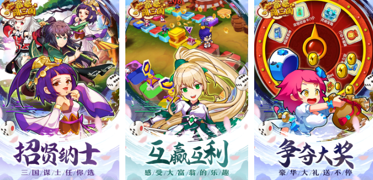 《富豪闯三国》以三国故事为背景,是一款融合了策略、卡牌和经营玩法为一体的手游。你将扮演三国时期的人物,在棋盘上购买不同的土地,在土地上建设学堂或兵营,并逐渐扩大自己的势力成为三国时期的富豪。此外,游戏还加入了战斗体系,你可以操纵卡牌,让他们成为你的兵,利用策略来战胜对手。