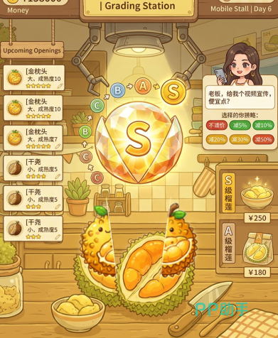 系统会根据果肉占比、厚度、甜度等维度自动完成品质评级,输出S级或A级结果。其中,果肉充盈、纹理清晰、无明显空腔的称为“报恩榴莲”,市场接受度高,可设定溢价出售;反之,若外壳过厚、果肉稀疏、果核占比异常,则归类为“报仇榴莲”,不仅难以盈利,还可能触发扣分机制。前期目标并非追求极限品质,而是稳定回本、控制损耗率,为中期扩张积累原始资金。
