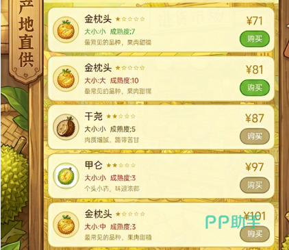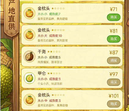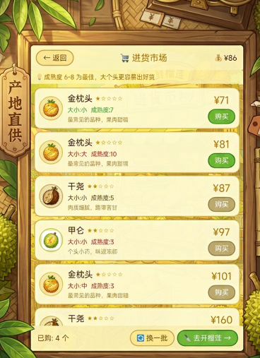 进货环节需重点关注品种特性与参数匹配度。当前版本开放金枕头、甲轮等多个榴莲品种,价格差异显著。其中金枕头综合表现最优:成熟度波动小(普遍维持在5–8区间)、甜度达标、果肉产出率稳定,非常适合新手建立运营节奏。而甲轮虽属高端品类,但单价偏高、成熟度容错率低,不建议初期投入。进货界面明确标注每颗榴莲的尺寸等级与成熟度数值,应规避成熟度低于5或个头偏小的批次,此类果实开出低产果肉的概率明显上升。单次采购量建议控制在4至6颗,快进快出,避免资金长期沉淀。