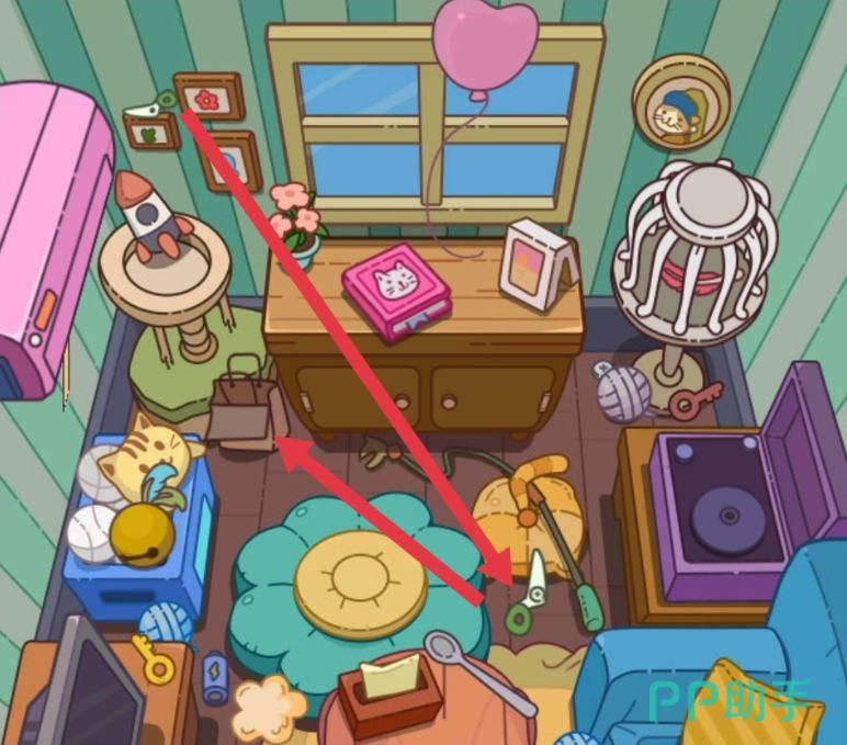 在前面的关卡中小伙伴们首先需要合成一把剪刀,然后使用剪刀将袋子剪开,接下来就把电池放入空调遥控器并启动空调,空调吹出的风将会把红羽毛吹向铃铛,与此同时大家还需要在桌上找到一个粉色书本,其中会有一个紫色书签,最后大家将沙发上的金币拖到书签那里就可以了。