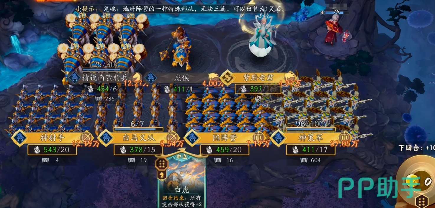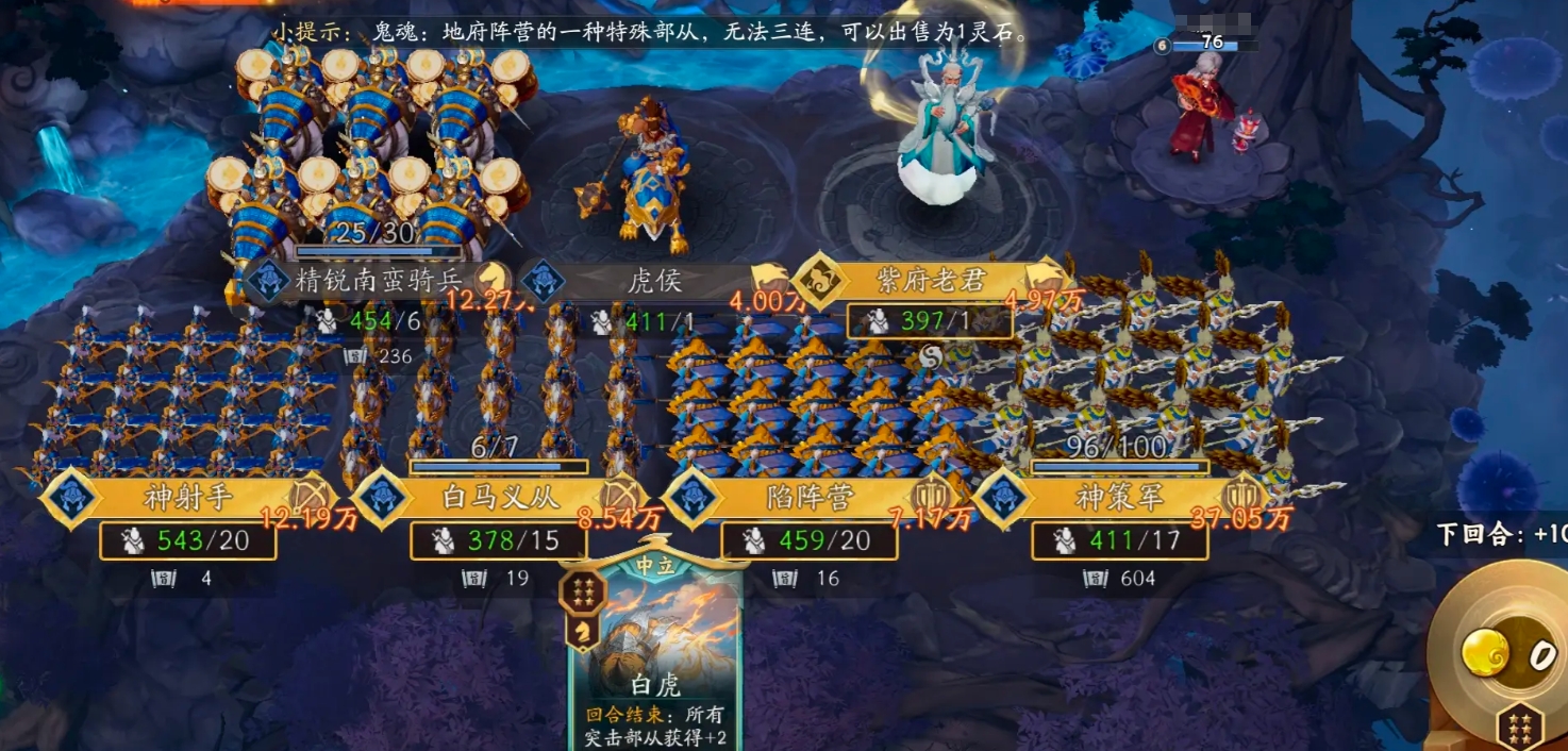 实战运营中,优先完成天书升级以尽早获取虎侯与紫府老君是核心策略。起手阶段应集中资源堆叠皇恩数量,确保虎侯能稳定触发基础效果;随后借助紫府老君的“额外发动一次”特性,将虎侯的增益循环反复激活,从而在单回合内快速铺开大量高战力部从。进入终局对战时,若手中尚存未使用的皇恩或具备皇恩赋予能力的支援牌,即可集中释放,形成连锁反应,实现部从数量与总战力的跃迁式提升,达成决定性压制。