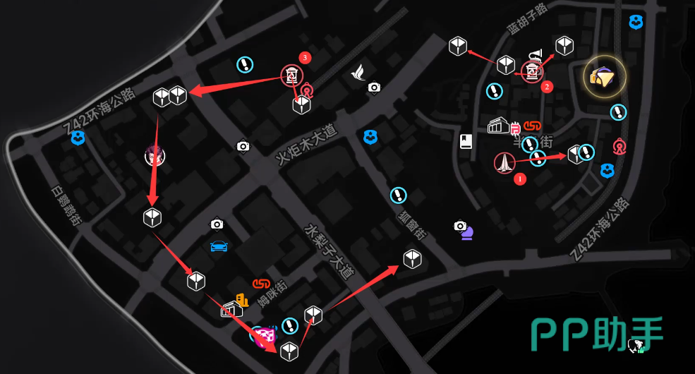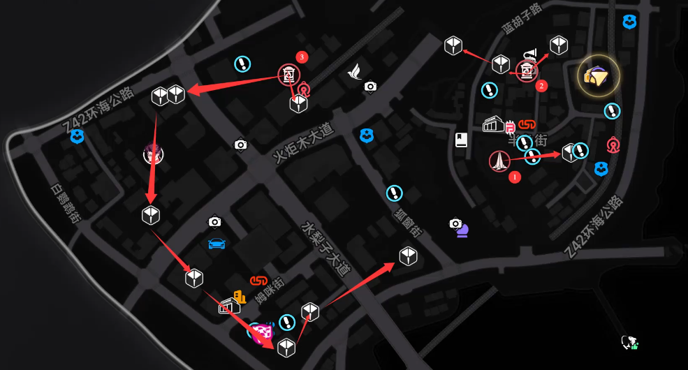 以首批开放区域“桥间地”为例,共设有12处“21的赠礼”点位。例如:完成“桥间地天际线”区域解锁后,可前往对面9°咖啡馆左侧巷道内(对应图中2号标识);或抵达伊波恩大本营外围,在邻近电话亭的位置(图中1号标识)发现目标。后续其他区域的点位分布将持续更新,建议结合地图标记系统进行系统性排查。