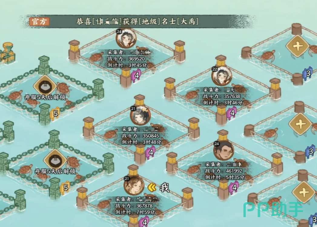 第一种方式为龟甲海域采集。进入该功能后,系统会自动为每位绘世者分配一片独立海域,每片海域内设有35个龟甲采集点,等级从1级到7级不等。等级越高的采集点,单位时间内产出的龟甲数量越多。玩家最多可同时派遣三支队伍进行驻扎采集,每个采集点均有累积上限,达到上限后资源将自动回收并返回主城。