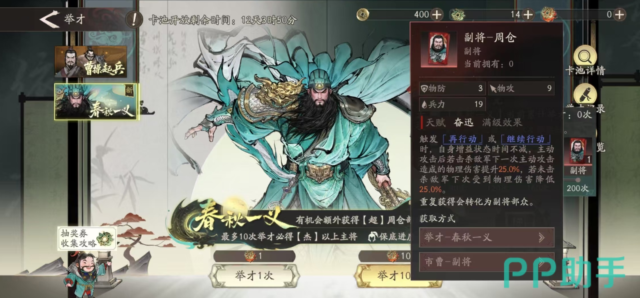 周仓的核心天赋为“奋迅”,其效果机制极具战术价值。当角色触发再行动或继续行动时,已有的增益状态持续时间不会衰减。此外,在主动发起攻击并成功击杀目标后,下一次主动攻击的物理伤害将提升13%;若未能击杀,则下一次受到的物理伤害降低13%。此处的“再行动”指额外获得一次完整回合机会,“继续行动”则表示在当前回合结束前利用剩余移动力执行操作。