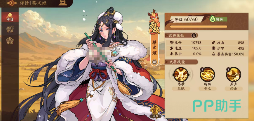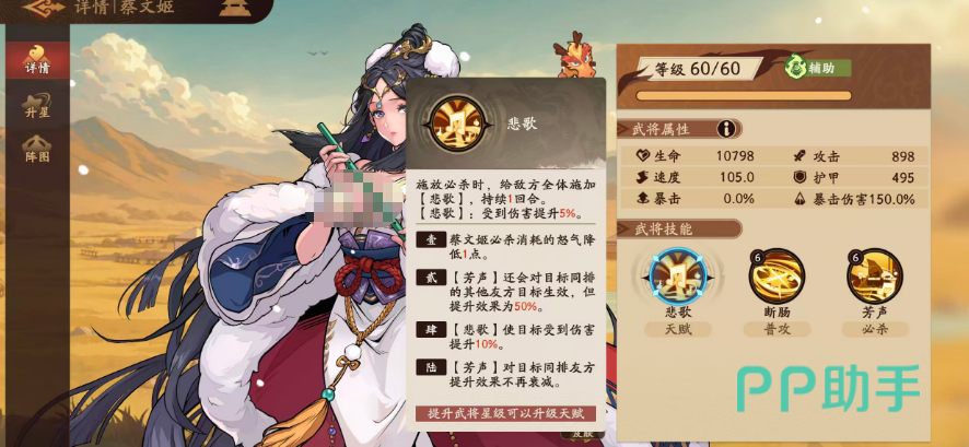 蔡文姬当前定位为功能性辅助,主技能【悲歌】具备群体减益特性:释放必杀技时,可对敌方全体施加持续1回合的【悲歌】状态。处于该状态的目标,受到我方伤害时额外承受5%伤害增幅。当该天赋升至一星后,必杀技怒气消耗降低1点——这一调整显著缓解了前期怒气资源紧张的问题,使大招释放频率更稳定,保障节奏压制的连续性。
