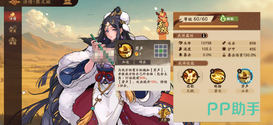 【芳声】作为核心主动技能,可为任意一名友方单位叠加1层状态,并使我方全体(除蔡文姬自身外)行动顺序提前30%。同时,所有携带【芳声】状态的单位,在接下来2回合内获得15%攻击加成。该双重增益构成“先手+输出”闭环,是构建高速循环阵容的基础支点。因此,蔡文姬最适配的体系为“无限推条队”,通过高频次行动轮次压缩对手反应窗口。