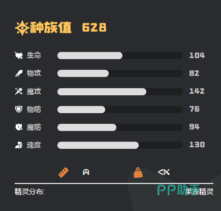 小皮球自身属性十分亮眼,总种族值高达628,其中魔攻达到142,速度为130,使其在施法效率和出手顺序上占据明显优势。104的生命值保障了其持续作战能力,而94的魔防也能有效抵抗敌方法术伤害。从抗性角度来看,该精灵对多种属性攻击具有良好的抵御效果,但在面对虫系对手时需格外小心,避免陷入不利局面。