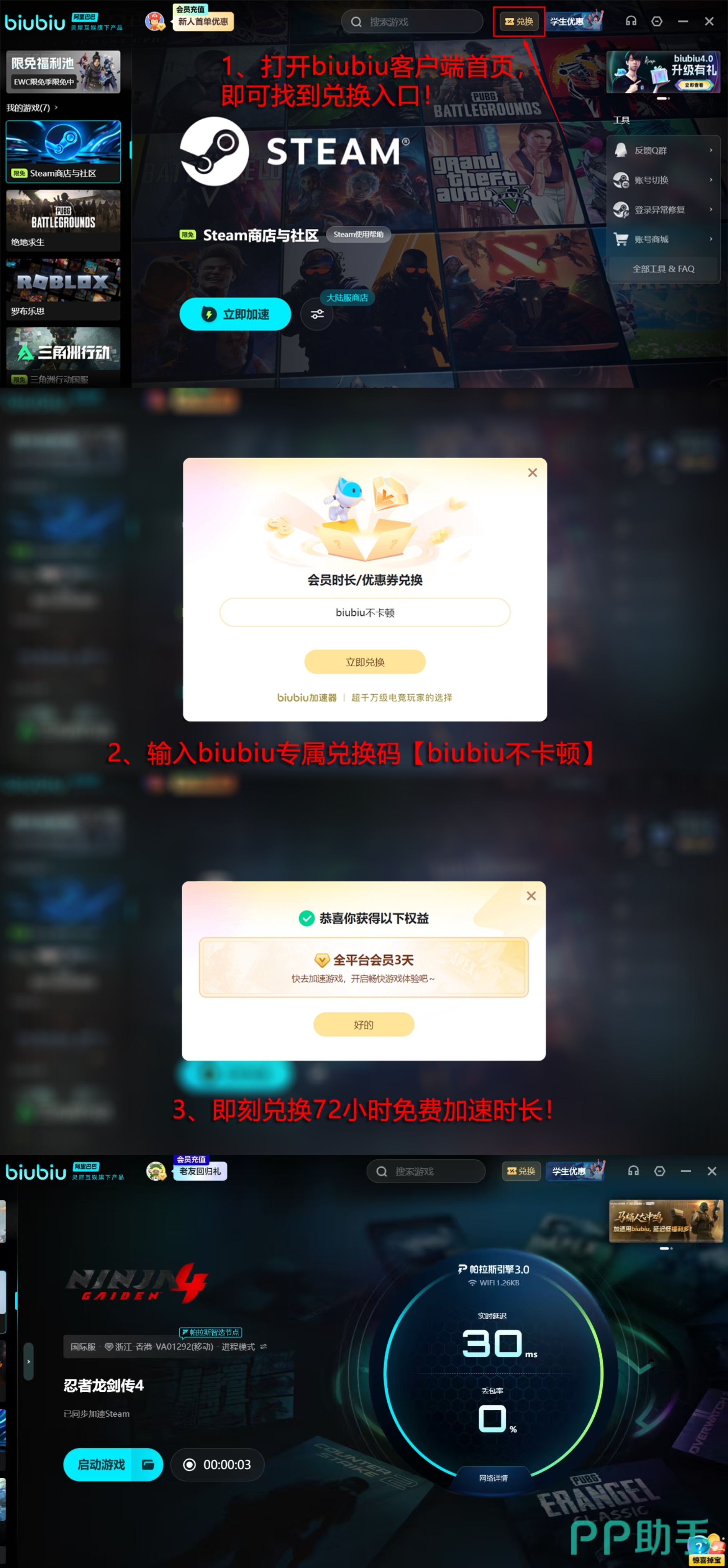 初次接触此类工具的用户可通过注册新账号获取24小时免费加速时长,同时所有玩家均可通过输入【biubiu不卡顿】兑换码领取额外3天免费使用权限,无需区分账号类型。完成设置后进入游戏,便能直观感受到其精细的画面设计与高强度的战斗节奏,也更能理解为何该游戏需要占用如此高的存储空间。
