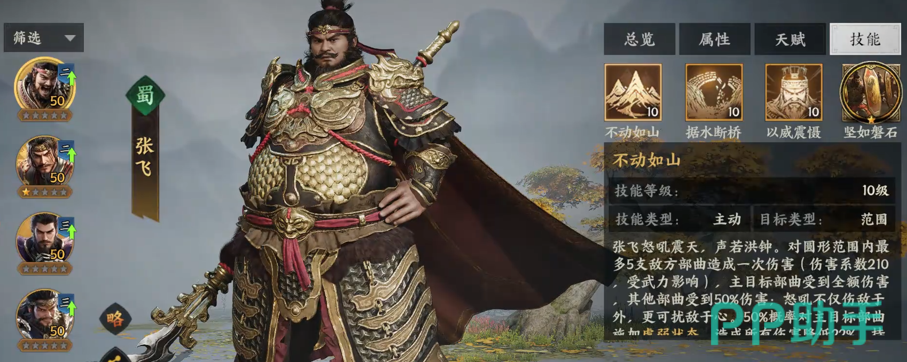 张飞在游戏中被设定为一名集控制与输出于一身的综合性武将,属于通过主线任务或限时活动即可获取的初始核心单位。其技能设计高度贴合历史形象,具备群体控制、防御削减和高伤害释放三大核心功能。主动技能“不动如山”是其核心输出手段,能够对敌方全体造成相当于50%攻击力的范围伤害,并附带60%概率施加持续2回合的“眩晕”效果,同时为目标叠加“虚弱”状态(降低15%防御力,持续3回合)。该技能不仅拥有强力的打断能力,还能显著提升后续队伍的整体输出效率。随着技能等级提升,伤害系数与控制成功率均会增强,因此建议优先投入资源升级。二技能“据水断桥”为被动触发机制,当张飞当前兵力低于50%时,可获得25%攻击力加成并免疫所有控制效果(冷却时间45秒),这一特性使其在残局反打阶段具备极强的生存与反击能力,尤其在PVP环境中优势明显。