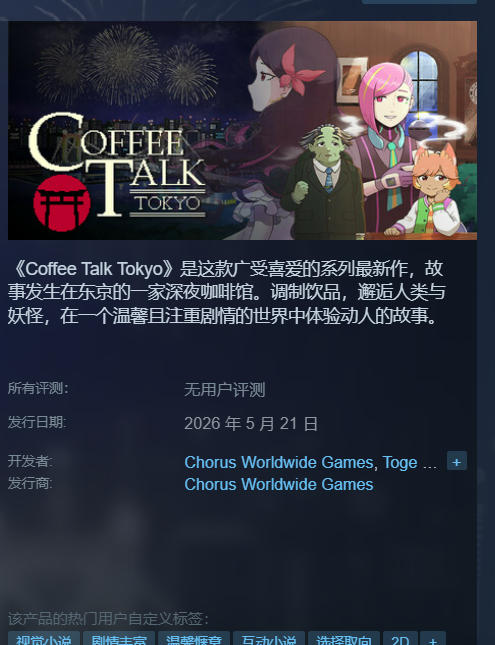 《咖啡心语:东京》是一款以情感疗愈为核心体验的叙事型模拟游戏,玩家将化身东京街头一家独立咖啡馆的主理人,在细腻光影与舒缓节奏中,通过调制专属饮品回应客人的内心故事。游戏定档2026年5月21日全球上线,为玩家提供一段沉浸于都市烟火气中的慢时光旅程。