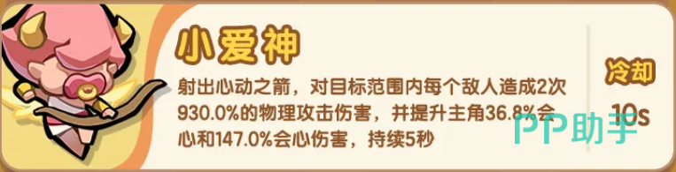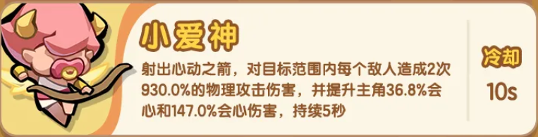小爱神专注远程辅助强化,发射「心动之箭」可对每个目标造成两次930%物理伤害。虽技能冷却长达10秒,但其不可替代的战略价值在于:登场即为主角提供36.8%会心率与147%会心伤害加成,大幅优化主角输出循环质量,尤其适用于会心流或极限暴击构筑。