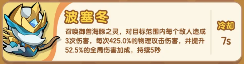波塞冬作为核心召唤型伙伴,可释放「海豚之灵」御兽,对范围内敌人发动三次独立攻击,每次造成425%物理伤害。该召唤物不仅提供稳定AOE输出,更可在后期激活全队伤害加成效果,实现“自保+增益”双重价值。