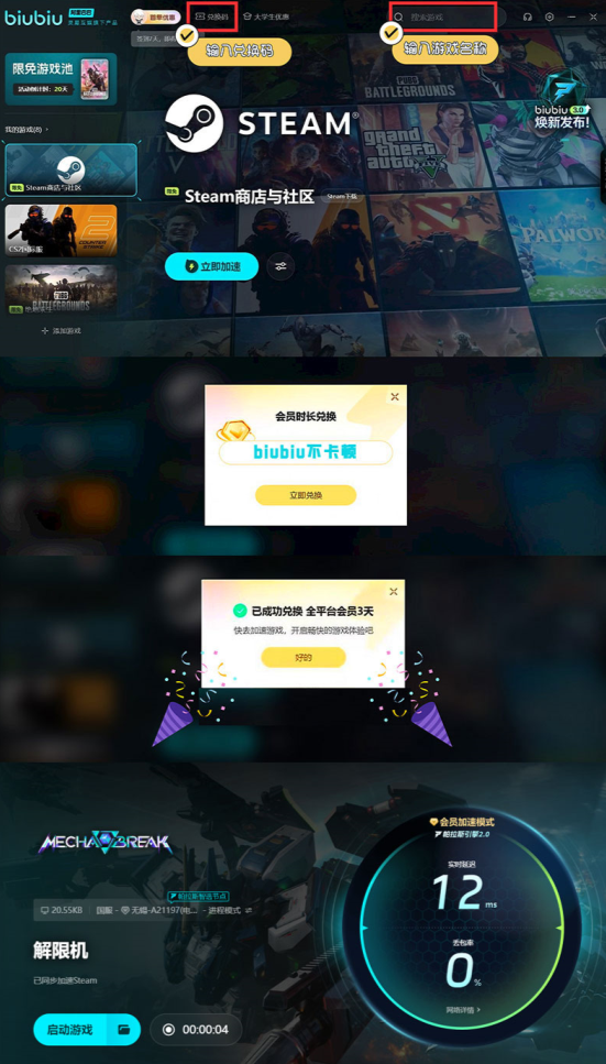 玩各种机兵时可以点击上面的链接下载biubiu加速器进行加速,现在用biubiu可以获得新用户注册得3小时的免费时长的福利,另外输入兑换码【biubiu不卡顿】还能再兑换3天的免费加速机会。