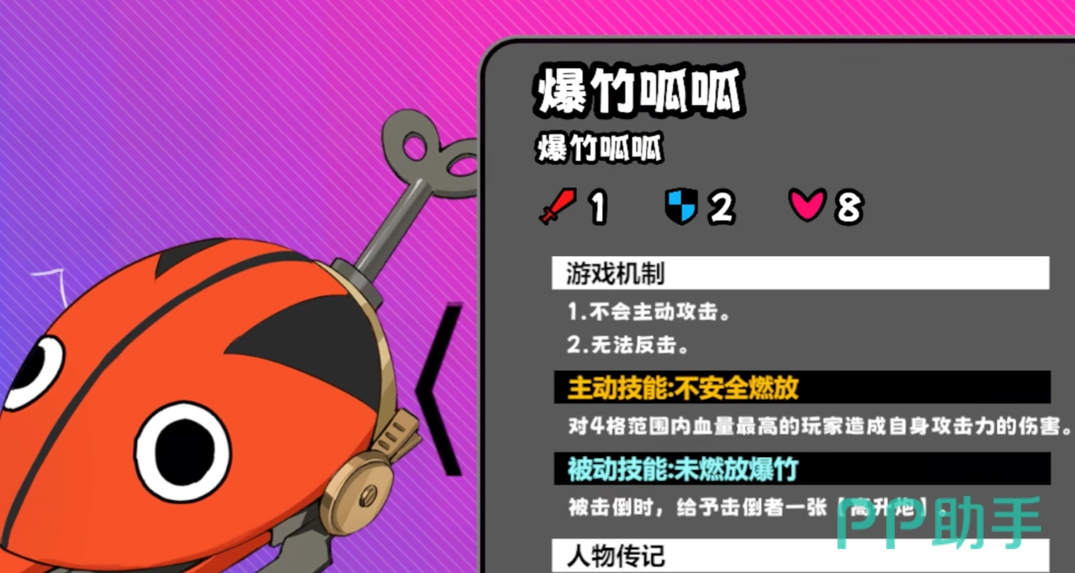该单位为低威胁常规怪,无主动攻击意图,亦不具备反击判定。其唯一威胁在于:存活状态下,每回合自动对自身四格范围内当前生命值最高的玩家施放一次等额于自身攻击力的单体伤害。被击败后固定掉落效果手牌【高升炮】,该手牌可清除Boss叠层并附加额外伤害。由于机制透明、无规避难点,队伍中任意具备中等以上输出能力的角色均可在首回合将其快速清除,无需预留特殊资源应对。