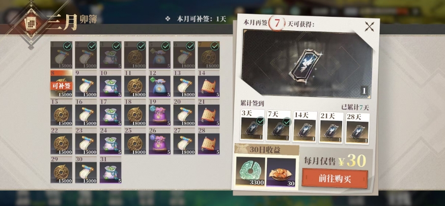 其实卯簿这个词在旧时候可是有着特定含义的呢,它原本是官署中所使用的名册,通俗来讲,就像是现在单位里用来点名的那种册子啦,而在这个游戏里,它对应的其实就是大家再熟悉不过的每月签到功能,从游戏的主界面右上角,大家就能看到一个相应的按钮,点击进去之后,就可以顺利找到卯簿的入口啦,当大家进入这个界面后,就能清晰地看到当前的卯簿情况啦,每个月通过卯簿能获得的奖励,其实和很多游戏里常见的月签奖励大同小异。