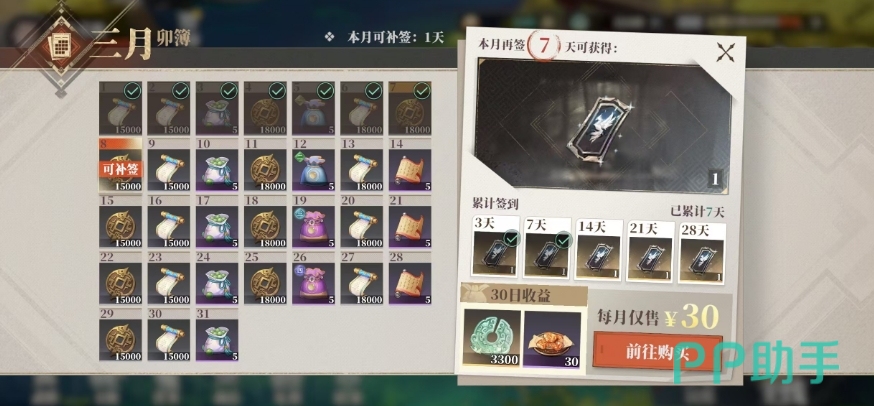 只要按时签到,还能额外获得韬略·百战以及风物通用的碎片,这些碎片能够用来给紫色风物进行升星,除了这些基础的签到奖励之外,游戏还设置了连续签到奖励机制哦,如果能连续签到3天、7天、14天、21天或者28天的话,就可以分别获得1个常驻抽卡资源,不过有时候大家可能会因为一些特殊情况不小心漏签了,这时候也不用太过于担心,游戏里还是很贴心地给大家提供了补签的机会。