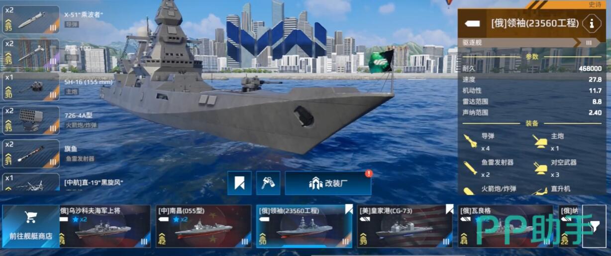 它的主要克制是在航母上,组队时搭配054A护卫舰补防空。单排局带烟雾弹干扰锁定,用山体遮挡规避远程火力。对抗潜艇优先切火箭炮+鱼雷速杀,避免被近身雷击。遇到朱姆沃尔特等高防船,绕山打游击消耗。高阶玩家换装电磁炮(射程200公里)针对航母,导弹替换为东风-17(变轨突防)。升级双波段雷达提升探测距离,优先锁定敌方核心单位(如指挥舰)。资源多可买专属涂装“暗影突袭”强化隐蔽性。
