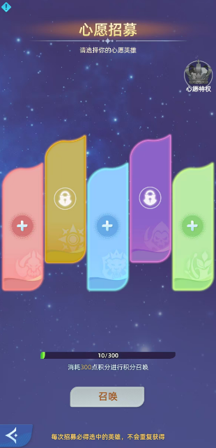 心愿招募是实现定向角色获取的核心系统。玩家可在心愿清单中最多锁定5名未拥有的指定英雄。每次抽取除基础概率外,还将按固定比例累积心愿积分;积分满额后,可100%兑换清单中任一未拥有角色,且系统自动规避重复获取。这意味着资源投入高度可控、无浪费风险。召唤券可通过日常任务、成就系统、周常挑战等途径稳定获取;若短期缺口较大,亦支持使用代币或活动积分进行等价兑换,确保心愿进度持续推进。