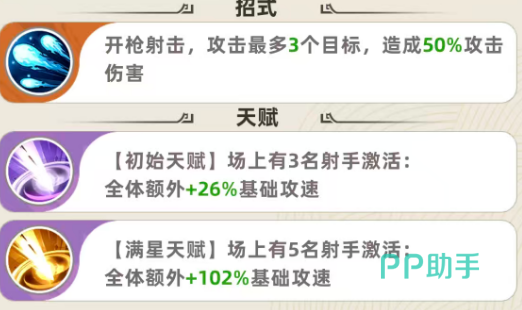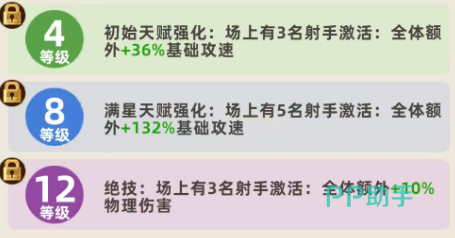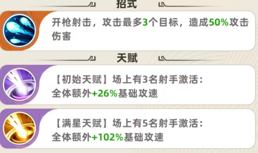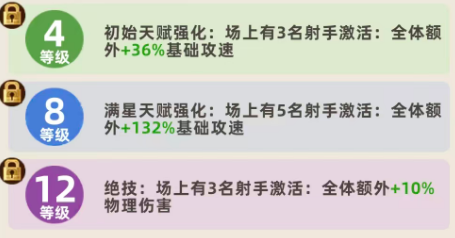 羁绊协同方面,马可波罗对射手体系有极强适配性。当场上存在3名射手时,其初始天赋即可触发全体26%基础攻速提升;该效果可与羁绊加成叠加生效,而非相互覆盖。进入高星阶段后,若达成5射手羁绊并激活马可波罗满星天赋,全队将额外获得102%攻速增益——这一数值在当前版本中属于顶尖水平,甚至超越多数高稀有度射手的极限成长上限。