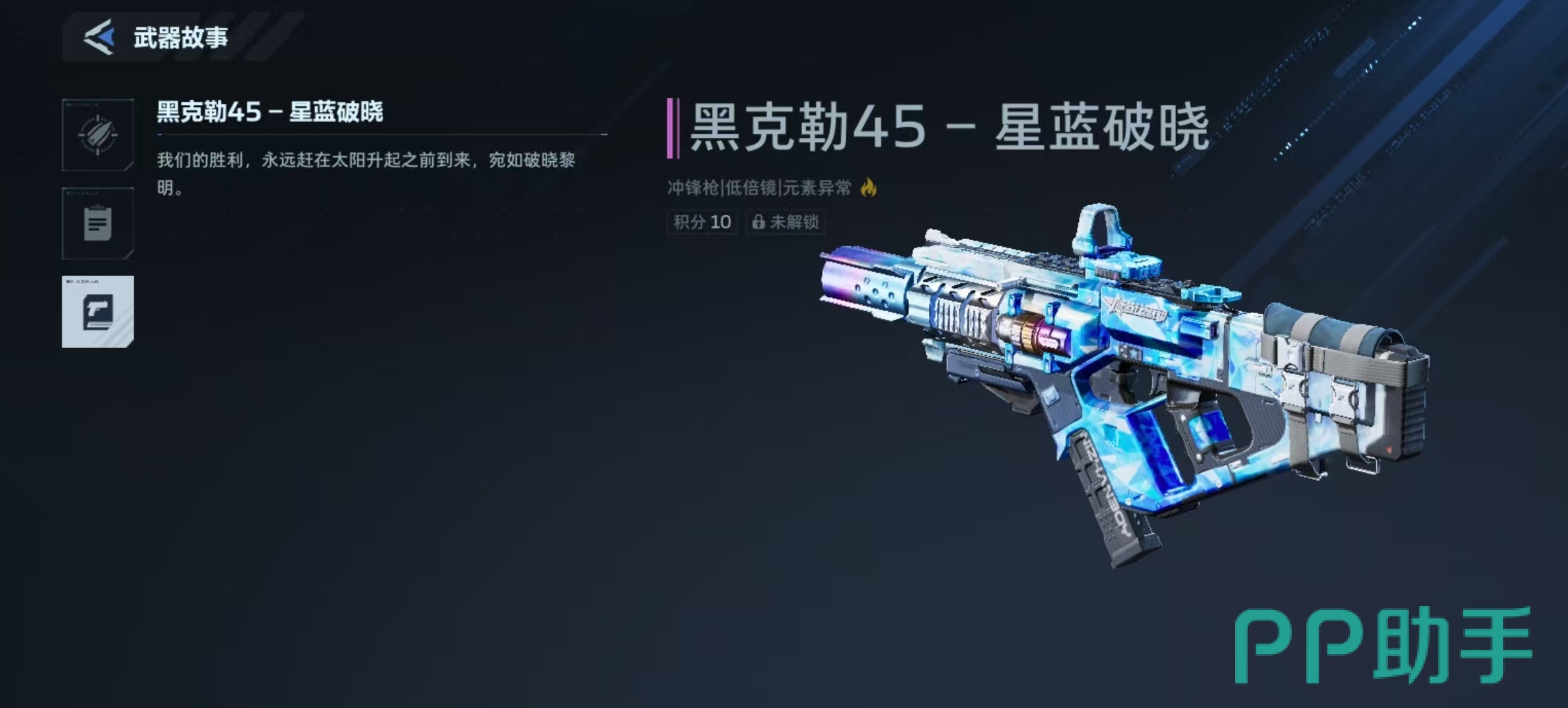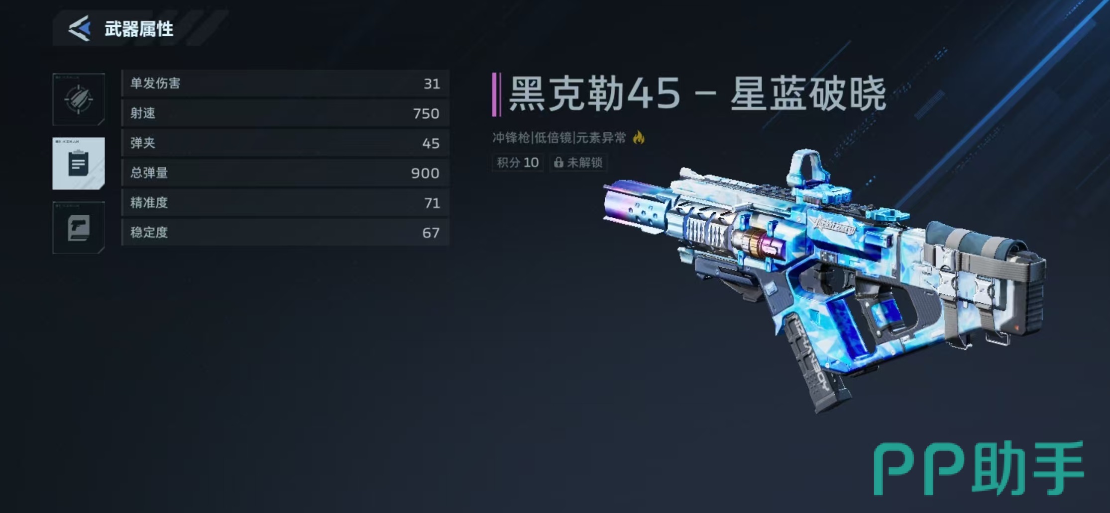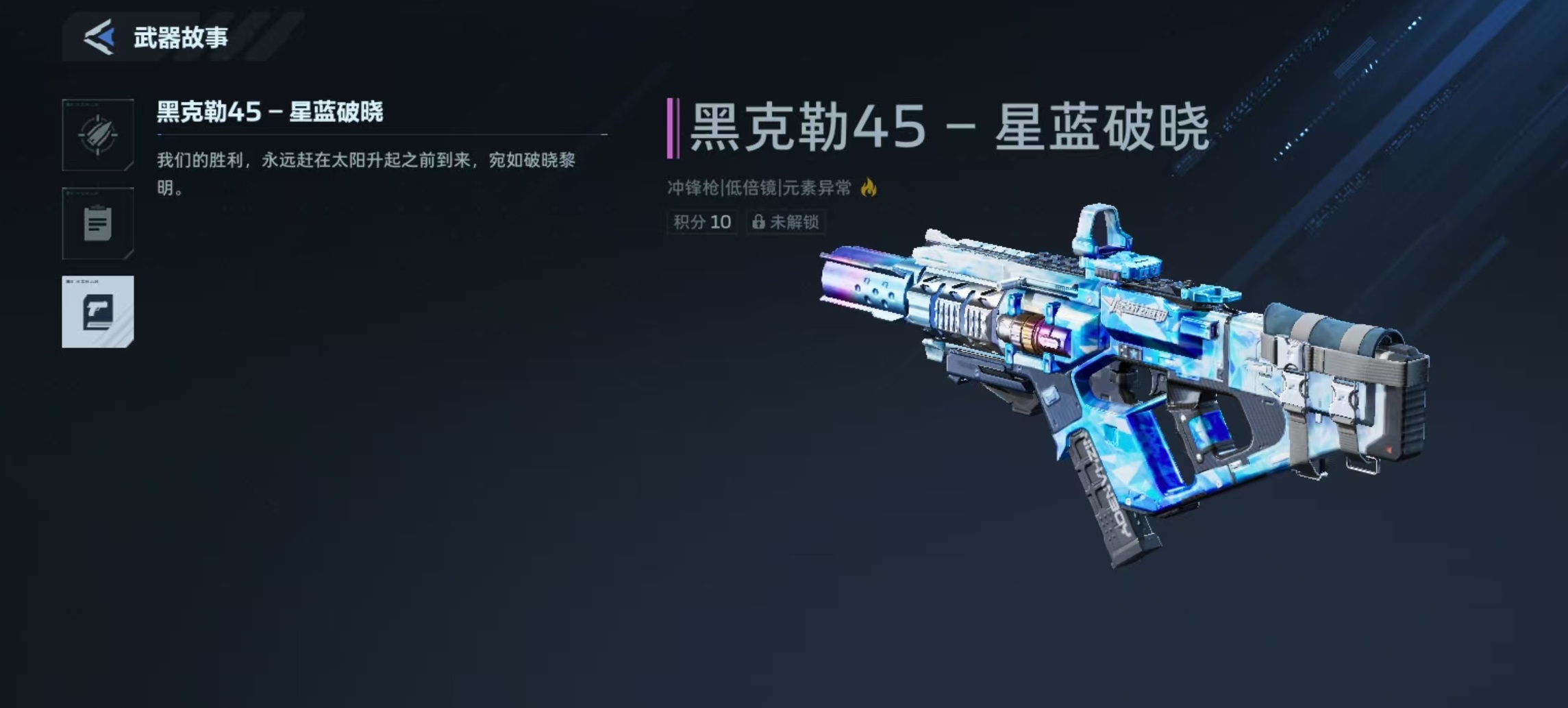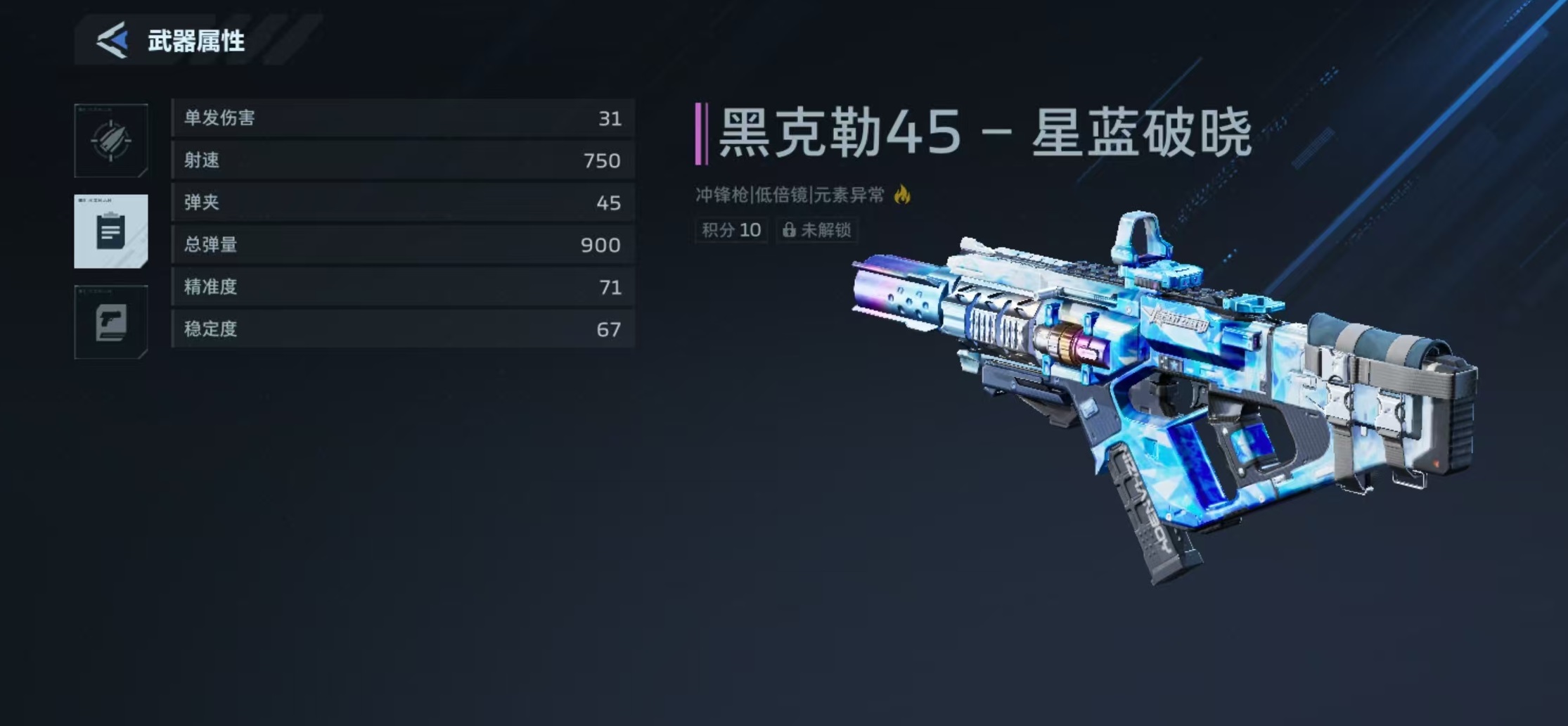 黑克勒45是《逆战:未来》中玩家初入游戏时默认配备的经典冲锋枪,凭借稳定的操控手感和适中的性能参数,成为新手过渡与日常刷图的首选。在基础枪械体系之上,官方陆续推出了多款主题化皮肤版本,其中“星蓝破晓”因其鲜明的科幻美学风格与实用战斗机制,广受玩家关注。本文将详细解析该武器的获取方式、核心属性及实战应用策略。