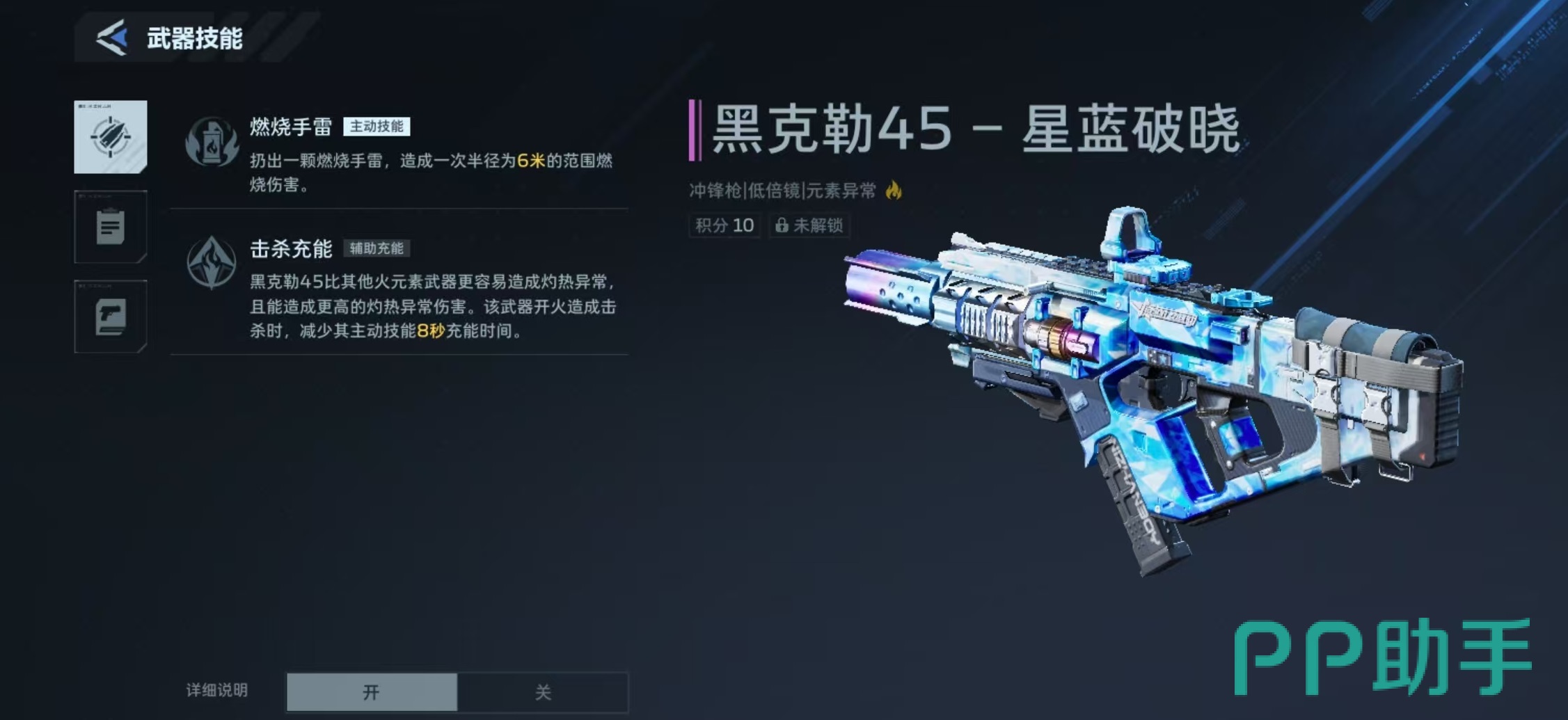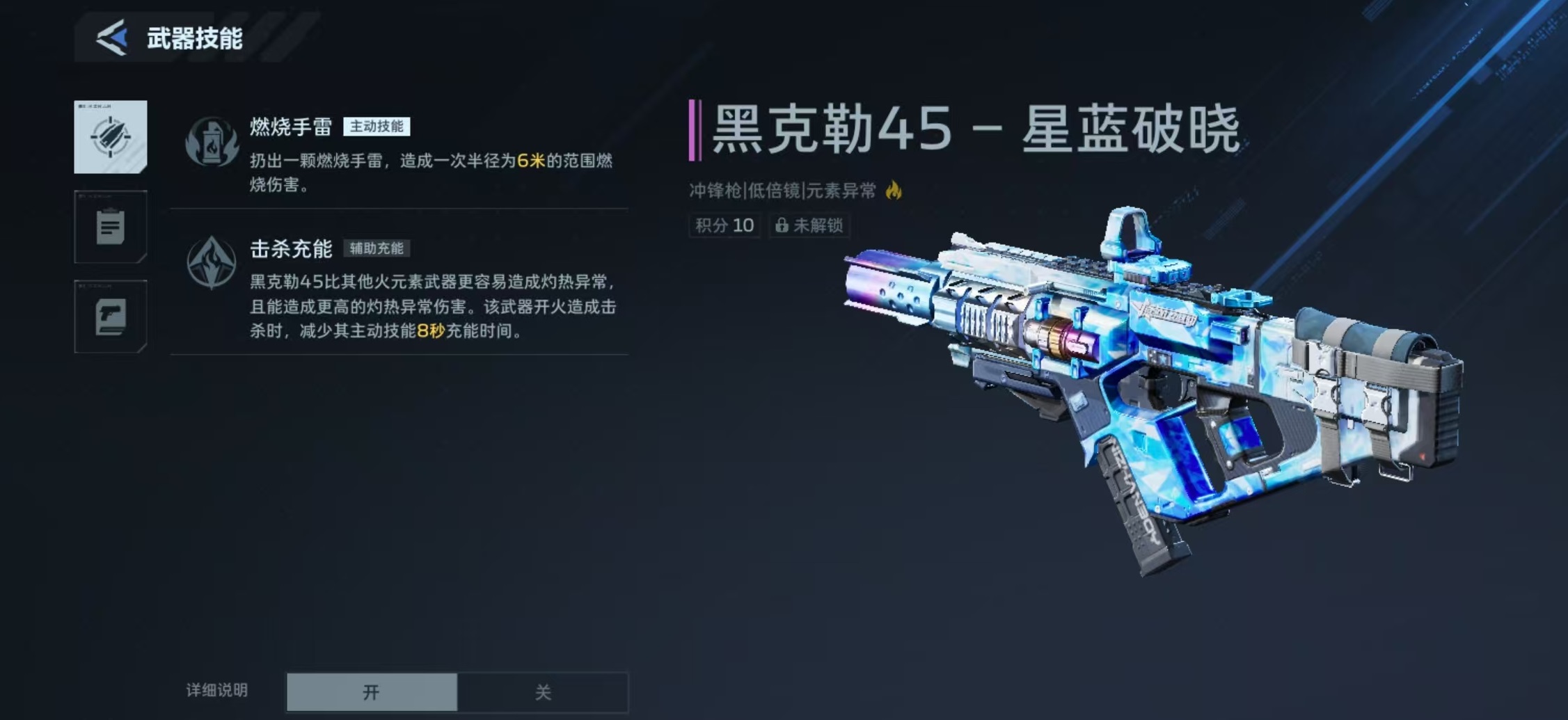 外观设计上,“星蓝破晓”以冷调科技蓝为主色,辅以流光纹路与能量脉动特效,在保留黑克勒45原有结构轮廓的同时,强化了近未来武器的视觉辨识度。性能方面严格继承原枪定位:单发伤害31点,理论射速750 RPM,弹匣容量45发,总携弹量900发,精准度71,稳定度67。技能系统包含两项专属能力:其一为“燃烧手雷”,投掷后对半径6米范围内敌人施加持续火伤;其二为“击杀充能”被动,可显著提升灼热异常状态触发效率,并在开火击杀目标后,主动技能冷却时间缩短8秒。