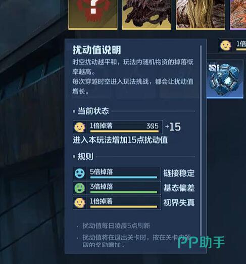 除了基础爆率外,《逆战未来》的开箱还受到“扰动值”机制的影响。每次进入时空穿越类挑战关卡,扰动值将增加1.5点。当前界面显示为1倍掉落效率时,右侧会出现黄色笑脸图标,表示处于“视界失真”状态。系统将掉落概率划分为三个层级,扰动值越高,稀有物品的获取几率理论上也会提升。每日凌晨5点扰动值会自动重置,若在关卡中拾取空瓶并退出,还可额外增加数值。建议玩家每日挑战次数控制在5次以内,避免扰动值过高导致进入最低掉落区间,从而影响收益。