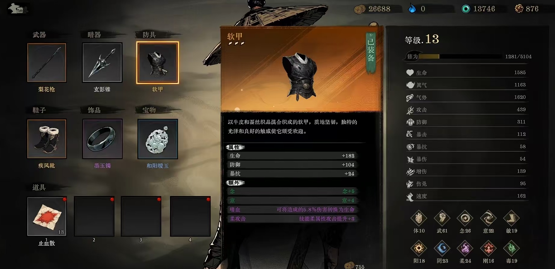 除传统刀、剑、枪、棍四大主武器外,游戏独创暗器子系统。玩家可同时装配多类暗器,并通过专属天赋解锁投掷逻辑与协同机制。暗器技能可无缝嵌入主武器连招间隙,触发位移打断、状态附加或伤害追加等复合效果,显著拓展连段深度与实战容错空间。整体装备生态围绕“收集—强化—词条塑形—流派验证”闭环展开,既保留Roguelike的随机构筑乐趣,又融合RPG式长期养成价值。