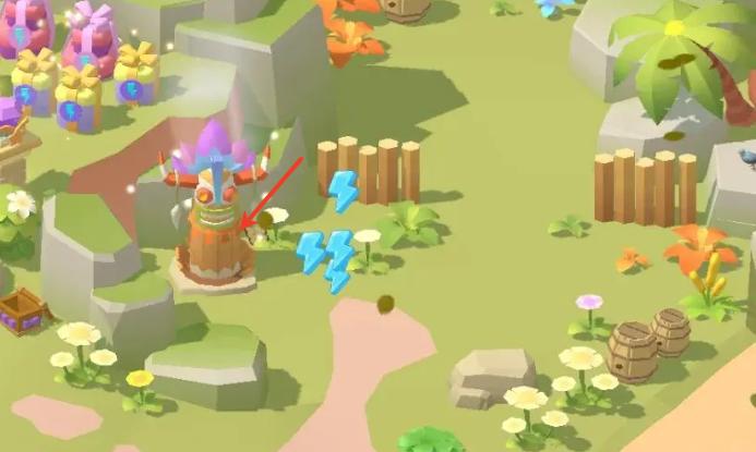 接下来介绍土著岛中的几个隐藏互动元素。岛上几乎所有建筑、座椅等静态物件都支持点击交互,每次点击有机会获得金币或恢复体力。此外,位于阶梯旁的木桶也是可点击对象,不要遗漏。图腾装饰物同样具备互动功能,点击后可领取额外体力奖励。不同颜色的花丛也分布于各处,逐一点击也能带来资源收益。