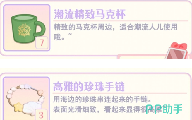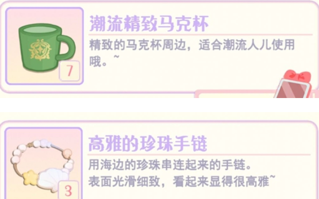 Gemi是游戏里非常温柔可爱的一个角色,想给这个角色赠送礼物的话,那就可以选择比较符合对方气质的珍珠手链,这是用海边珍珠穿起来的手链,佩戴之后能显出这个角色的高雅,玩家也可以选择把潮流精致马克杯赠送给对方,另外还有凯丝,这是裁缝铺的店长,这个角色比较喜欢毛茸茸的物品,玩家可以选择把毛茸茸手机挂件赠送给对方。