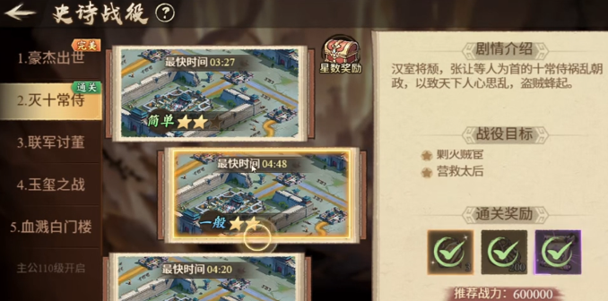 史诗战役按难度划分为普通、精英、地狱三档,各档位星级独立结算。通关用时为唯一评分依据——时间越短,星级越高。累计达成指定总星数后,可开启稀有宝箱,内含武将进阶材料及关键养成资源,对前期角色成长具有决定性作用。新手建议优先完成主线任务引导的普通难度关卡,快速掌握基础战斗机制与规则逻辑。该阶段默认赠送太史慈、黄忠、张飞三位武将,其技能特性高度互补:张飞提供高爆发单体输出,太史慈具备稳定持续伤害能力,黄忠则承担远程压制职能。此三人组合足以应对普通难度全部挑战,资源投入应聚焦于1–2名核心武将,避免分散培养。