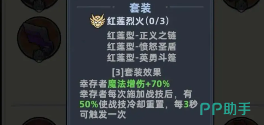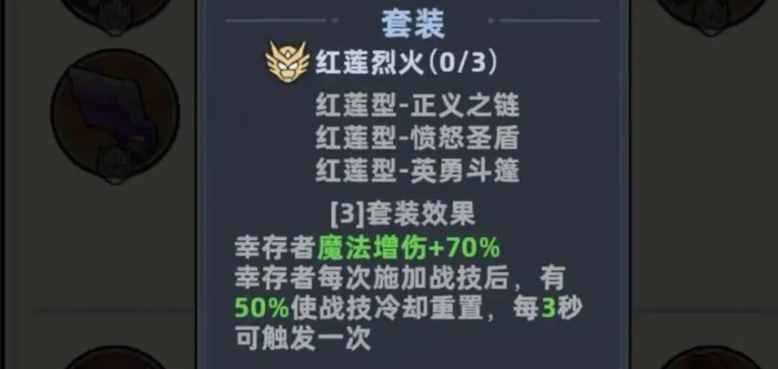 内圈套装推荐红莲三件套。该组合具备双重机制优势:一是提供高额魔法伤害加成,二是技能命中后可重置冷却时间,触发间隔固定为3秒。实战中,以天使为代表的功能型英雄可借助该机制实现双次增伤叠加,配合合理技能循环,既可提升单轮爆发峰值,又能保障中长期作战续航能力。