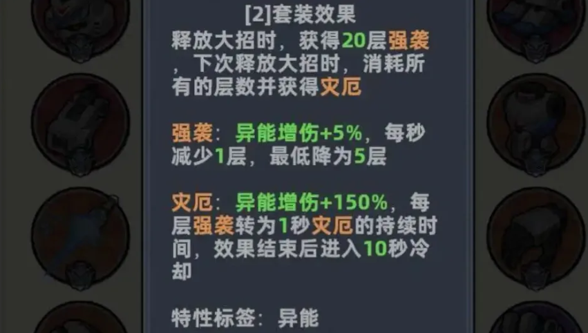 外圈套装需按成长阶段动态调整。新手期无需强求六件套成型,建议以秘境295层为节点分界:此前优先集齐两件套过渡。动能两件套可提供稳定异能伤害增幅,输出曲线平滑;擎天两件套则以低触发门槛与高容错率见长,适合操作尚未熟练的玩家建立手感。二者均优于散搭词条组合,即使面板数值略低,实际战斗效能仍明显占优。