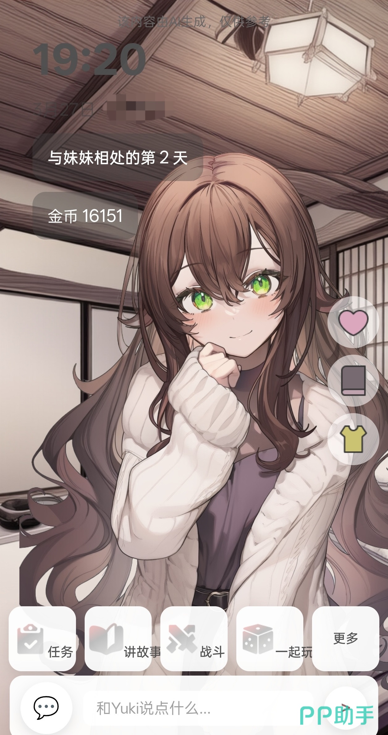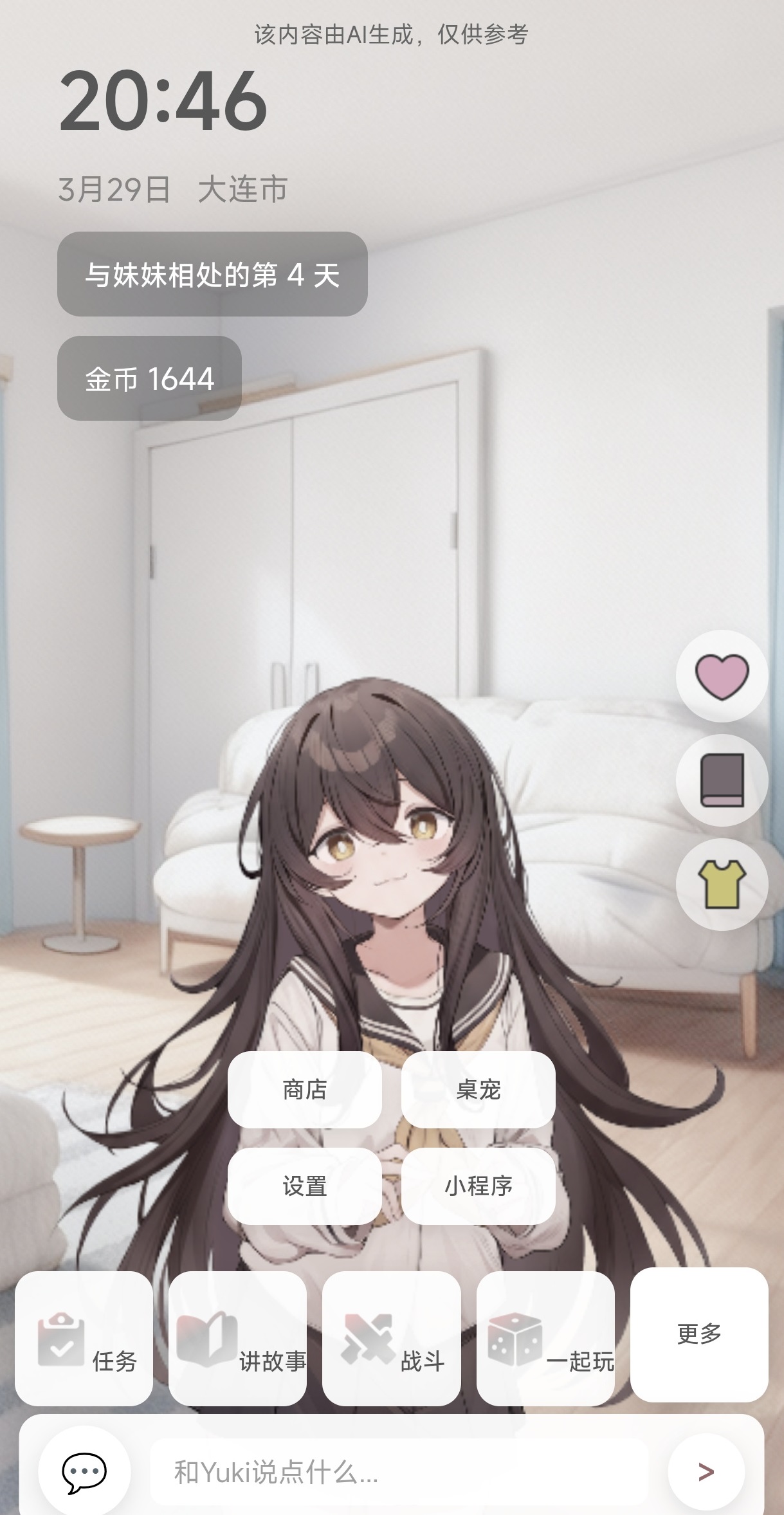 本作突破传统RPG框架,定位为AI生活陪伴类模拟游戏。主角YUKI是一位具备长期记忆能力的虚拟妹妹角色,其性格并非预设固定,而是随玩家互动行为动态演化。游戏中不设线性关卡,全程以自由对话为核心交互方式,支持文字输入与语音交流两种模式。系统自动识别并持久化存储关键对话信息,使YUKI能在后续互动中主动呼应过往事件。开局可选择“哥哥”或“姐姐”身份,不同身份引导出差异化行为逻辑,进而影响YUKI的性格发展路径,涵盖可爱系、傲娇系、病娇系等多种成长方向,均由玩家自主塑造。