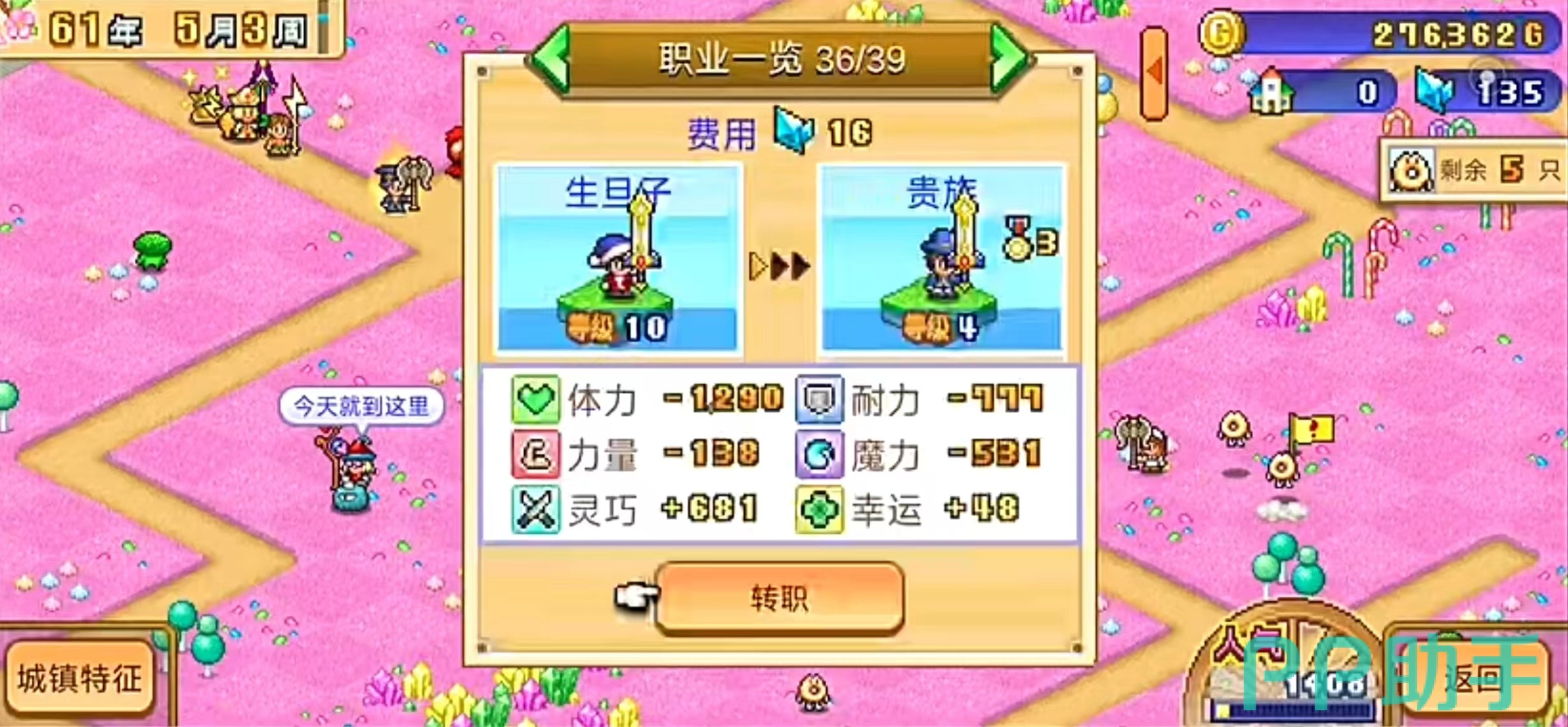每一个人物都需要去是满十级和入住,这样的话就会解锁商品和职业,但部分的特殊职业需要城镇五星才能够去解锁,例如一村的公主和国王以及二村的玩偶装。每一次的升级对某些人物的属性都是会有略微的加成的,所以满级的人物属性会非常的高,但有一部分的任务天生职业没有达到满级的时候,别的人物也是不能够去解锁该职业的转职的。