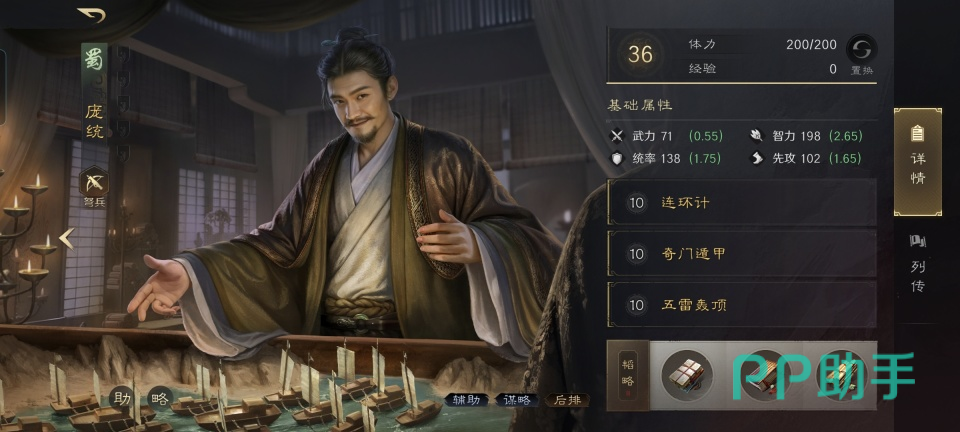 三国谋定天下庞统强度解析:新赛季“砺兵砺伍”机制下,这位蜀汉顶级谋士迎来质变级强化。作为首批开放专属战法激活资格的武将之一,庞统需通过天赋点解锁其三项核心专属韬略,且所有专属战法均为个人独占,不可共享或传承。本文将围绕其三大主战法、阵营联动效果及兵种适配逻辑展开深度拆解,助玩家精准把握实战定位。