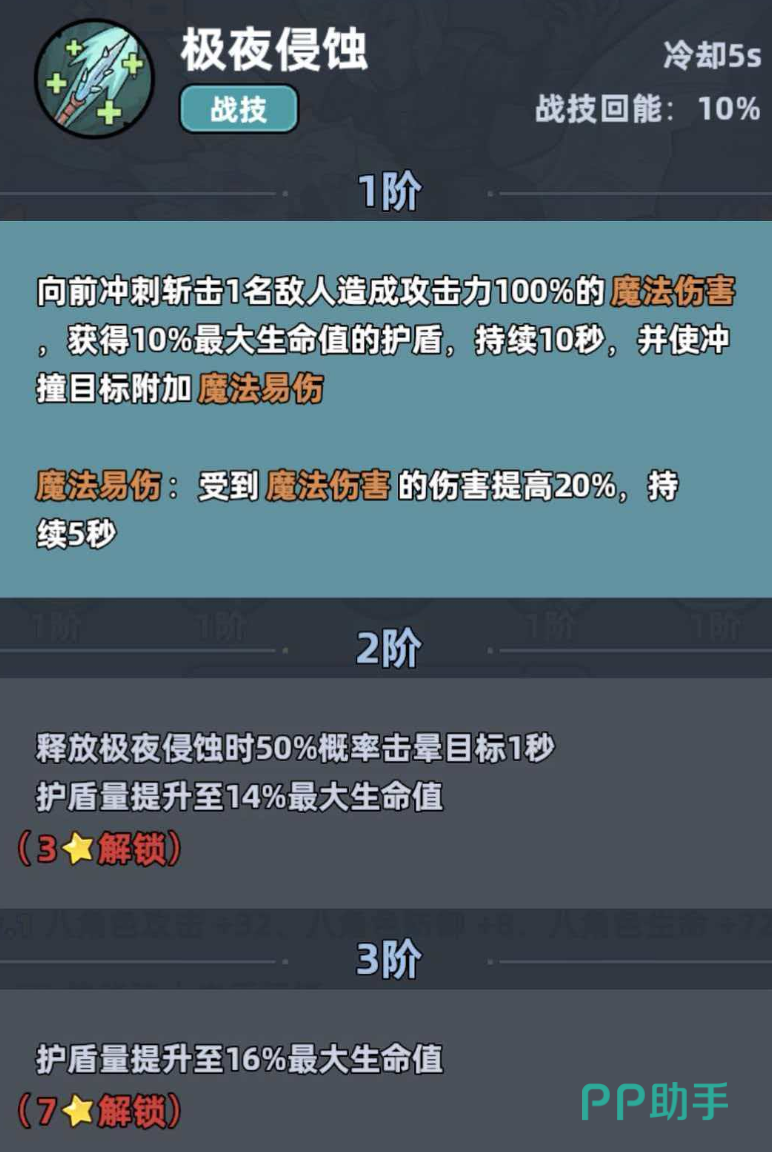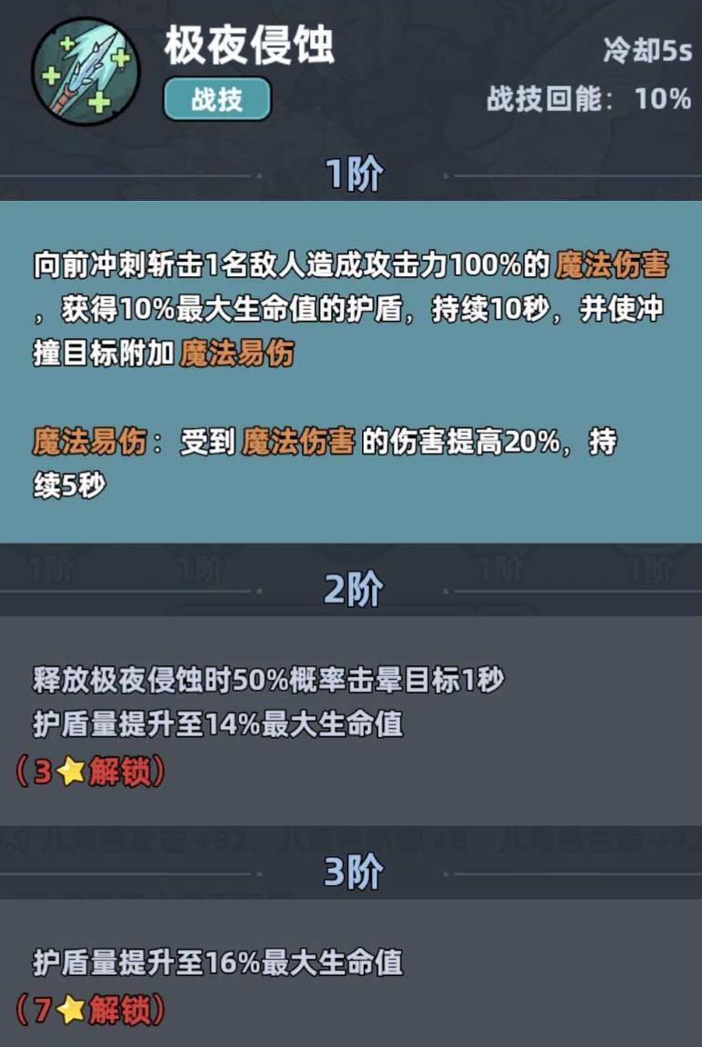 当触发“极夜侵蚀”状态时,飞龙骑士将向前方发动一连串魔法打击,并立即为自己叠加一层护盾。该技能存在多重成长维度:每提升一级,护盾基础量增加;同时提升自身魔力20%,并增强20%魔法攻击力;此外,技能命中后还将按等级逐步提高眩晕敌人的概率,实现从防御到反制的战术延伸。在面对高爆发敌人时,该技能既能承担关键伤害吸收任务,又能通过控制链打断敌方节奏,为团队争取关键输出或调整时机。