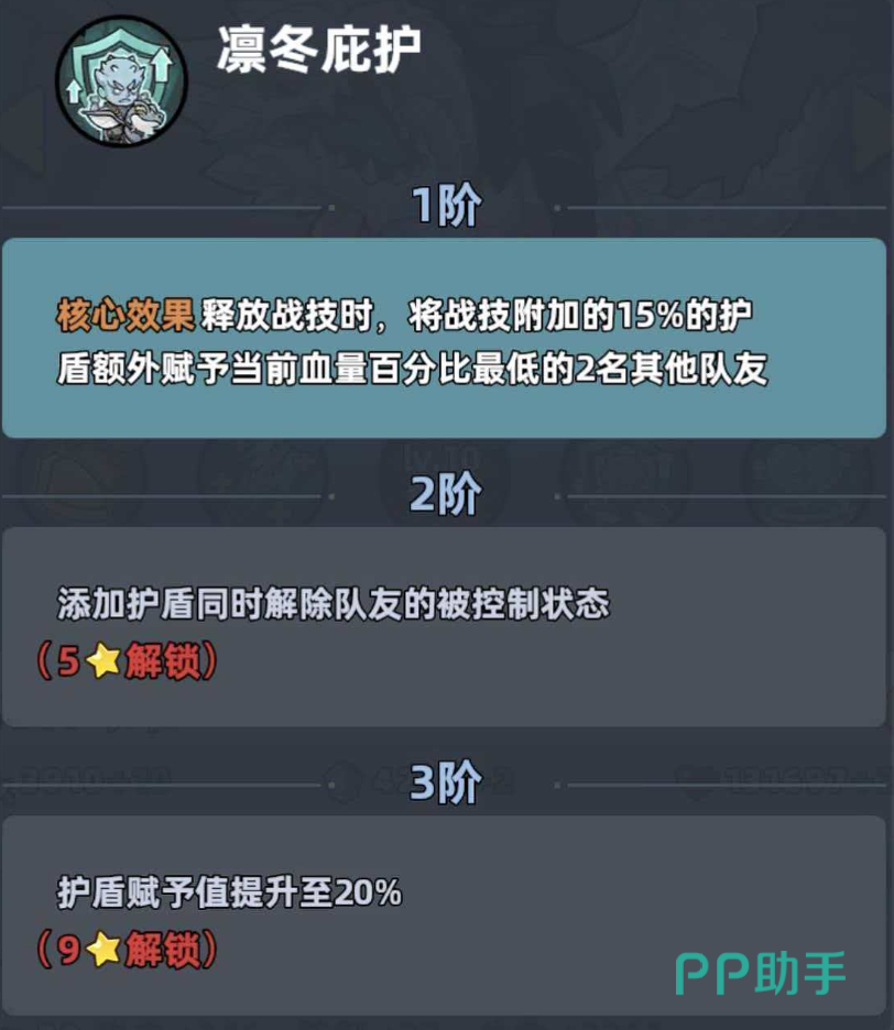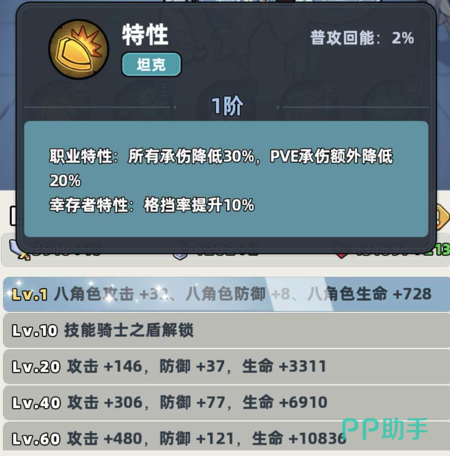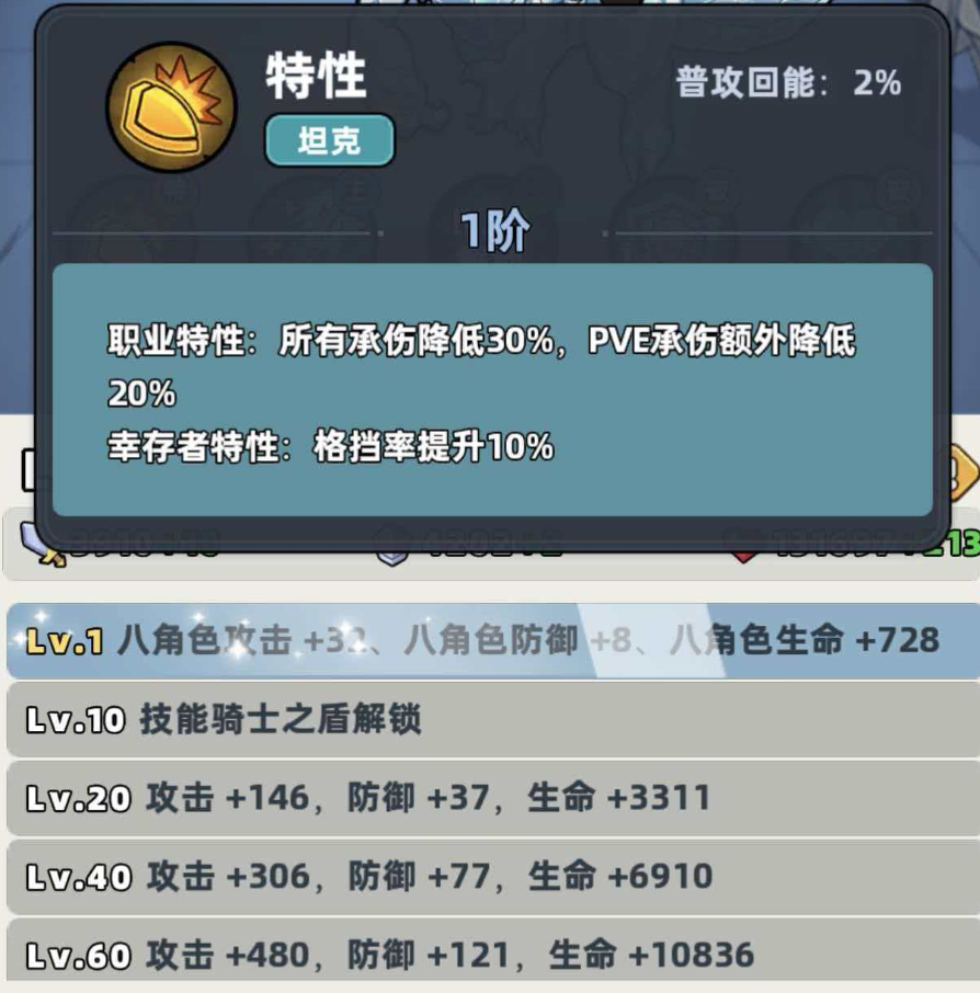 该角色的基础生存机制扎实:被动技能可使自身所受全部伤害降低30%,在PVE环境中实际减伤幅度按设定逻辑下调20%(即最终生效减伤为10%),确保其在高压环境下的持续站场能力;同时,出战状态下格挡率额外提升10%,进一步压缩敌方有效输出窗口。其核心主动技能为魔法攻击型,不仅能对前方扇形区域造成可观魔法伤害,还可为全体友方单位生成百分比护盾——该护盾具备自动回复特性,且数值随技能等级成长而线性提升,显著强化团队整体容错上限。