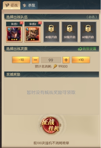 在征战挂机过程中,玩家可以通过更改高级设置来选择自动征战时首选的城池目标类型,这样可以更有针对性地获取资源,然而需要注意的是,处于征战挂机状态中的队伍会被视作参与城战,无法再参与其他城战,因此主公需要合理分配征战挂机的时间,避免在己方军团发起攻城或城池遭到攻击需要防守时,队伍被占用导致无法及时参与战斗。