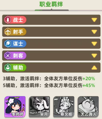 辅助职业侧重反伤机制,定位为团队防御补充。李师师、蔡文姬、太乙真人、孙膑、鲁班为其代表性成员。3辅助即可提供全体友方20%反伤加成,具备一定克制物理输出阵容的能力;5辅助满配时反伤提升至45%,但受限于场上卡位限制,实际达成难度较高,多作为副羁绊或特定环境下的战术补充使用。