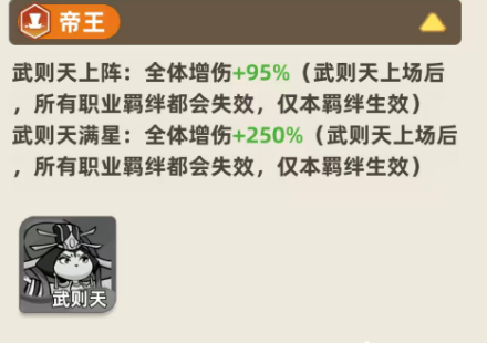 帝王职业为独立单羁绊体系,当前仅由武则天与刘邦构成。其中武则天上阵即触发全体增伤95%的效果,无需数量叠加,属即时生效型全局增益。但因其羁绊不可共存于其他职业组合,需牺牲全部常规羁绊收益,故实战中通常作为高难度极限阵容尝试,出场率较低。