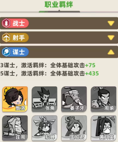 谋士职业聚焦法术强度提升,属于典型的输出型羁绊。甄洛、张角、姜子牙、周瑜、庄周为常见组成单位。3谋士提供全体75点基础攻击力加成;5谋士则提升至435点。该羁绊直接强化技能伤害,配合高频率施法英雄可显著放大整体爆发力,是法师流、功能型AOE阵容的核心支撑。