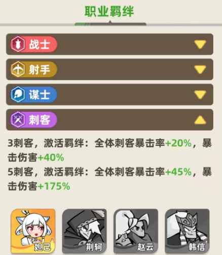 刺客职业强调暴击维度增益,兼顾概率与伤害双重提升。常用角色涵盖荆轲、赵云、韩信、妲己、赵飞燕、刘禅。3刺客激活时,全体刺客暴击率+20%,暴击伤害+40%;5刺客达成后,暴击率提升至+45%,暴击伤害增至+175%。该羁绊对切入后排、秒杀关键目标具备极强适配性,属高风险高回报战术体系。