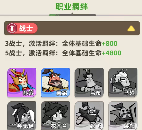 战士职业以高生存能力见长。可选角色包括孙策、袁绍、吕布、马超、钟无艳等。当场上存在3名战士时,全体友方单位获得800点生命值加成;若达成6战士阵容,则生命值加成提升至4800点。该羁绊门槛低、成长曲线陡峭,是构筑前中期坦度体系的高效选择。