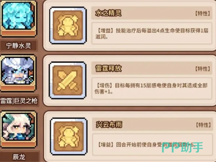 支援天赋方面需按角色特性精准匹配:宁静水灵推荐“水之精灵”,使其治疗溢出部分每4点生命值转化为1层滋润,持续强化团队状态厚度;巨灵之枪则适配“雷霆释放”,开场即赋予全队15层感电,并附加1%全伤害加成;辰龙自身首选“兴云布雨”,回合开始时直接获得6层滋润,加速进入高增伤节奏。