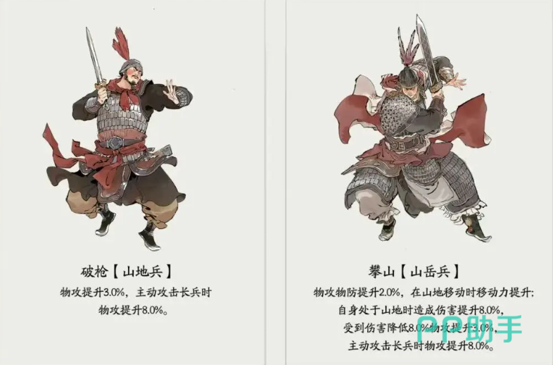 牵招的主动技能允许他位移到指定空地,同时对范围内敌人造成60%物攻的伤害,并施加“地劣”状态。若当前为山岳兵种,则额外为自己也添加“地劣”。技能升至2级后,若目标已处于“撕裂”状态,则额外施加“牵制”效果,进一步强化控制链。