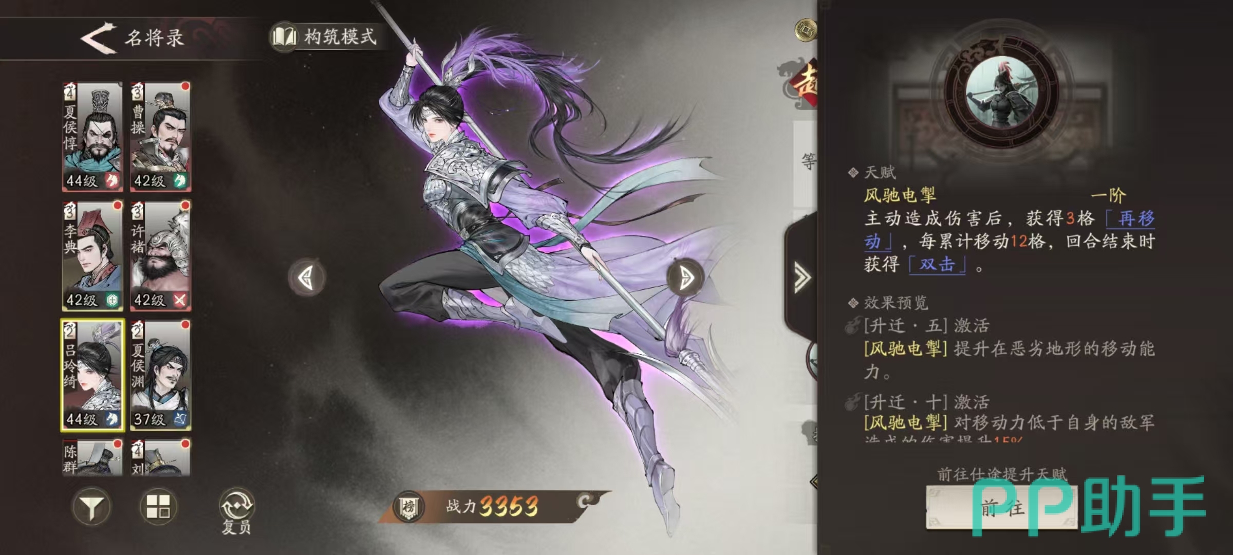 她的天赋技能名为风驰电掣,效果是在主动造成伤害后额外获得三格移动范围;每累计移动满12格,回合结束时还能触发一次双击。这一机制极大增强了她在战场上的持续作战与走位能力。为了最大化发挥其实力,技能搭配尤为关键。推荐配置为奔袭、弧光掠影与流星赶月三项技能。其中,奔袭基础物攻倍率为120%,且每次攻击前每移动一格可提升4%伤害,最多叠加至20%(即移动5格后达到140%)。该特性与吕玲绮的高机动特性完美契合,使其单体爆发极具威胁。