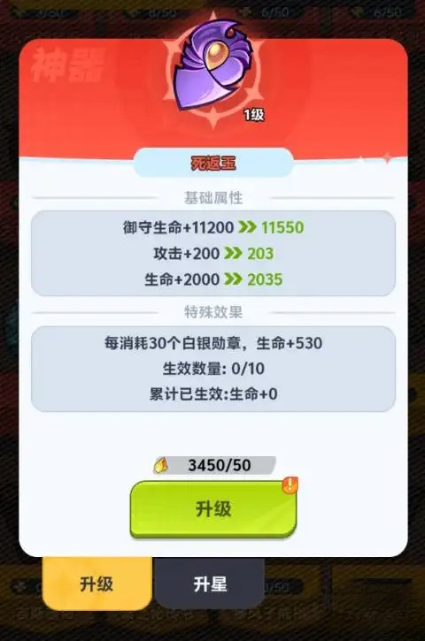 除单件属性加成外,神器还具备深层养成维度:当玩家持有特定数量的神器时,将自动激活羁绊效果,解锁额外百分比属性加成(如全队攻击力+8%、受击减伤+5%等)。该效果随神器总数递进提升,在满配状态下对最终战力形成质变支撑。以热门神器“死返玉”为例,其基础效果为提升攻击力与生命值;消耗30个白银勋章可激活1层强化,每层增加530点生命值,最高叠加10层,总计提供5300点生命值加成。