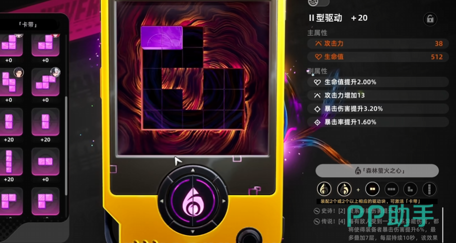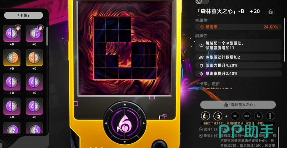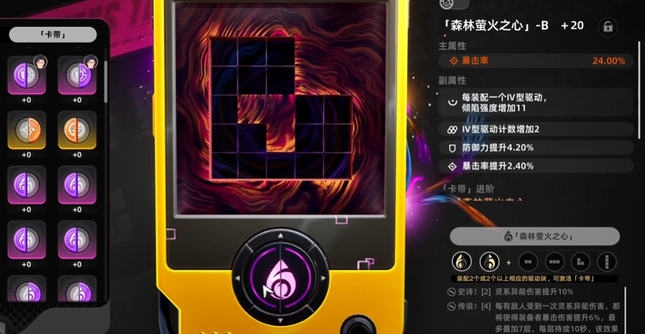 完成卡带安装后,界面右下角将显示由4个格位组成的驱动块配置面板。该面板对应上半区域,需嵌入4枚驱动块。每枚驱动块具备独立属性倾向与位置适配要求,其嵌入顺序与方位必须严格匹配当前卡带所定义的套装协议,否则无法获得协议加成。